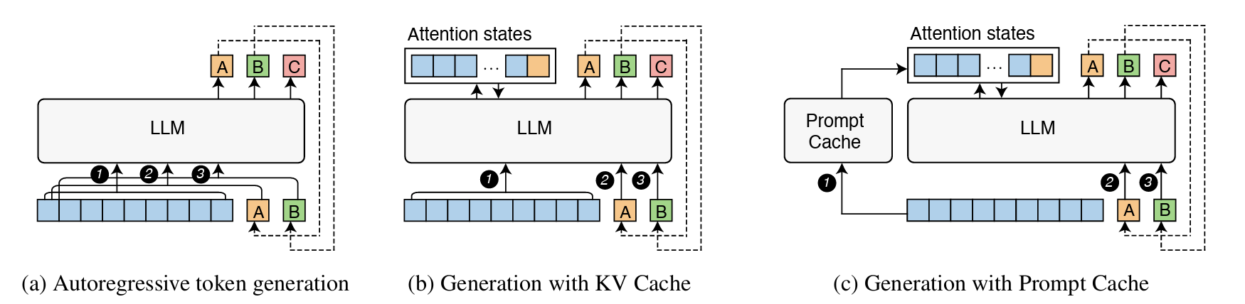 Below is a figure from the paper demostrating how traditional generation, generation with KV cache, and generation with a prompt cache are all different.